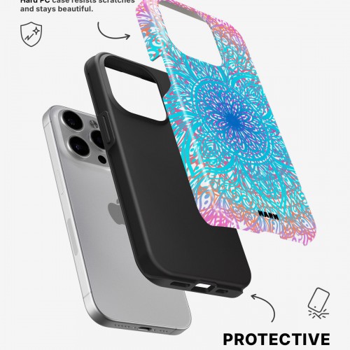 Meet the Tough Case for iPhone 15 Pro in Pastel Mandala. Strong on the outside, soft on the inside. This case is made to protect your phone from daily drops, scratches and surprises while keeping it stylish.