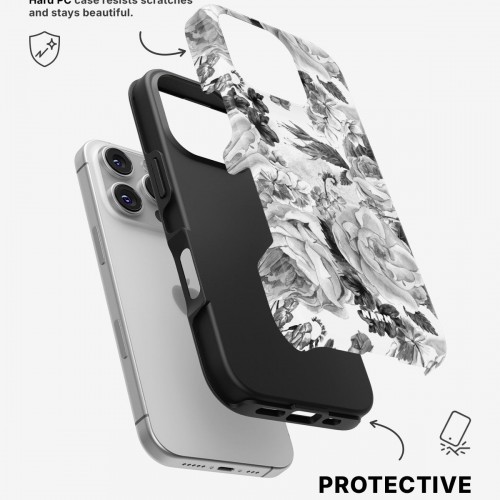 Meet the Tough Case for iPhone 16 Pro Max in the pattern: Black & White Bloom. Strong on the outside, soft on the inside. This case is made to protect your phone from daily drops, scratches and surprises while keeping it stylish.