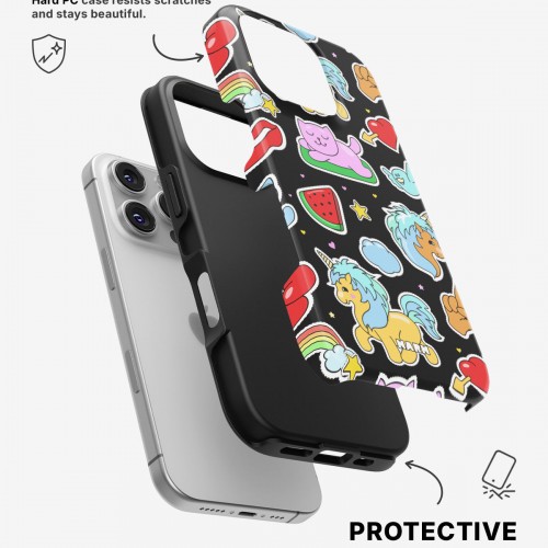 Meet the Tough Case for iPhone 16 Pro Max in the pattern: Cute Stickers. Strong on the outside, soft on the inside. This case is made to protect your phone from daily drops, scratches and surprises while keeping it stylish.