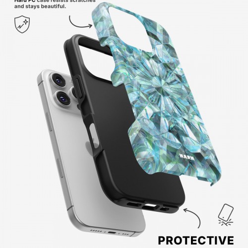 Meet the Tough Case for iPhone 16 Pro Max in the pattern: Green Crystals. Strong on the outside, soft on the inside. This case is made to protect your phone from daily drops, scratches and surprises while keeping it stylish.