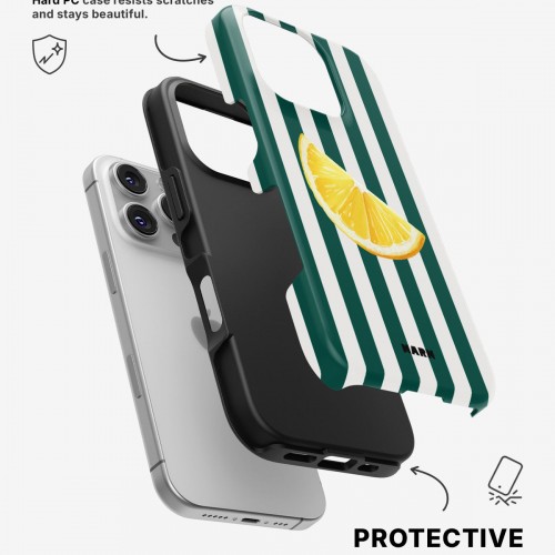 Meet the Tough Case for iPhone 16 Pro in Lemon Stripes. Strong on the outside, soft on the inside. This case is made to protect your phone from daily drops, scratches and surprises while keeping it stylish.