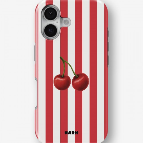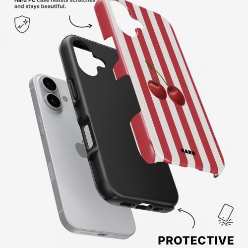 Meet the Tough Case for iPhone 16 in the pattern: Cherry Stripes. Strong on the outside, soft on the inside. This case is made to protect your phone from daily drops, scratches and surprises while keeping it stylish.