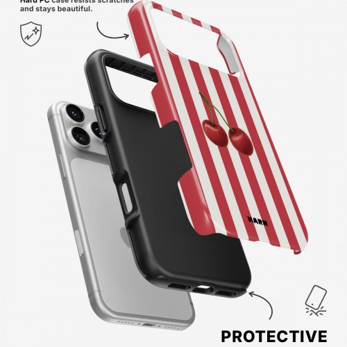 Meet the Tough Case for iPhone 17 Pro Max in the pattern: Cherry Stripes. Strong on the outside, soft on the inside. This case is made to protect your phone from daily drops, scratches and surprises while keeping it stylish.