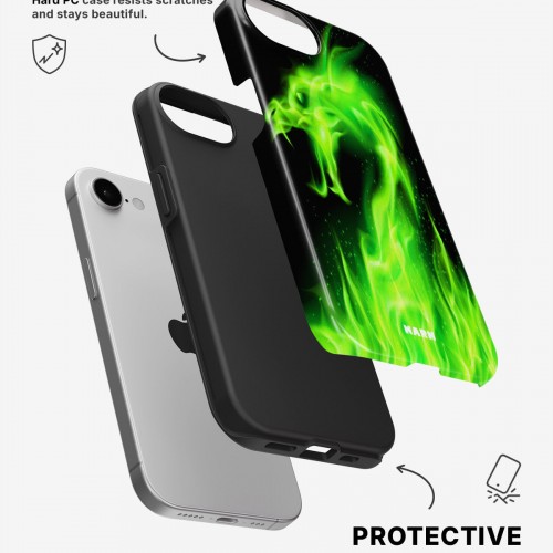 Meet the Tough Case for iPhone SE (2020/2022) in the pattern: Green Flames Dragon. Strong on the outside, soft on the inside. This case is made to protect your phone from daily drops, scratches and surprises while keeping it stylish.