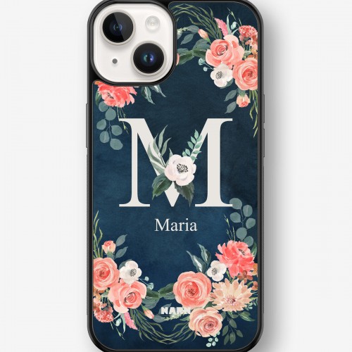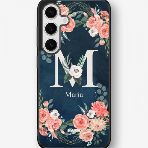 This design features: watercolor flowers, floral pattern, navy blue, monogram, romantic