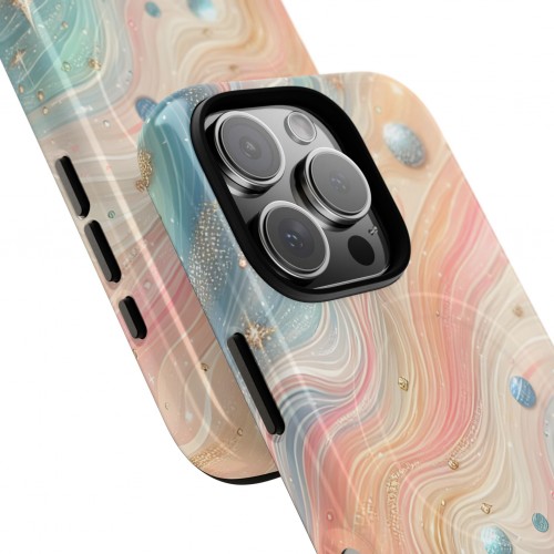 The Iridescent Swirls protective phone case features a striking wave motif in soft cream tones, forming a luminous and fluid pattern. Surrounding celestial-inspired accents add a subtle contrast, while flowing lines create visual balance and guide the eye across the design. Defined contours, smooth gradients, and a refined layout distinguish the style—delivering a modern, artful pattern crafted with attention to visual precision and contemporary design sensibility.