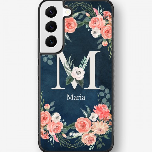 This design features: watercolor flowers, floral pattern, navy blue, monogram, romantic