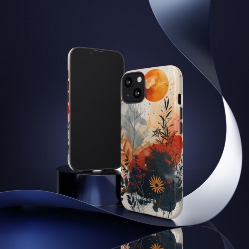 A bold orange sunburst dominates the center of this protective phone case, infusing the palette with dynamic, radiant energy. Warm, saturated tones are balanced by scattered splatter motifs and subtle crescent forms, which provide contrast and maintain visual flow throughout the design. Fine gradients and sharp delineations enhance the celestial style, giving the pattern a vibrant, contemporary edge—this motif demonstrates precise alignment and expert design for those valuing standout artwork and visual harmony.