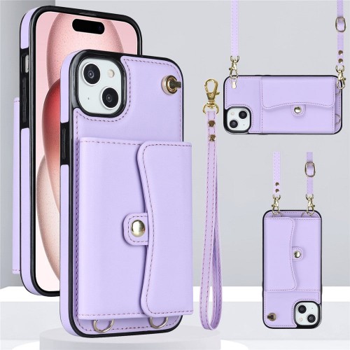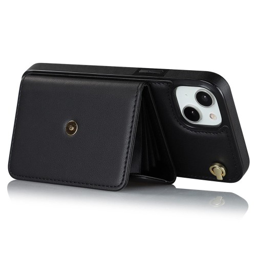 Phone Shell for iPhone 15 , Card Slots Drop Proof PU Leather+TPU Kickstand Cover with Short+Long Straps – Black