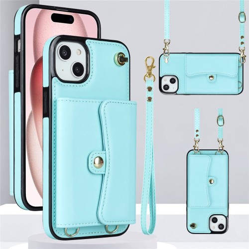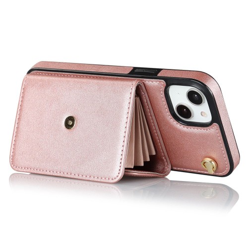 Phone Shell for iPhone 15 , Card Slots Drop Proof PU Leather+TPU Kickstand Cover with Short+Long Straps – Rose Gold