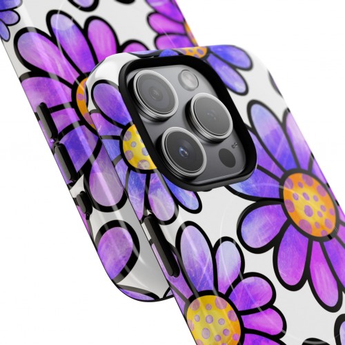 The main feature of this protective phone case is a bold arrangement of purple-hued floral circles, combining clarity in pattern with striking visual appeal. The vibrant purple palette enhances the floral style, integrating the circles motif directly into the design’s core. Surrounding elements include smaller accent dots and subtle leafy outlines, which create contrast by punctuating the background and guide the eye for balanced flow. This design stands out with crisp edges, symmetrical repetition, and a harmonious interplay between positive and negative space. Overall, the piece reflects precise artistic craftsmanship and an expertly structured motif for visual impact.