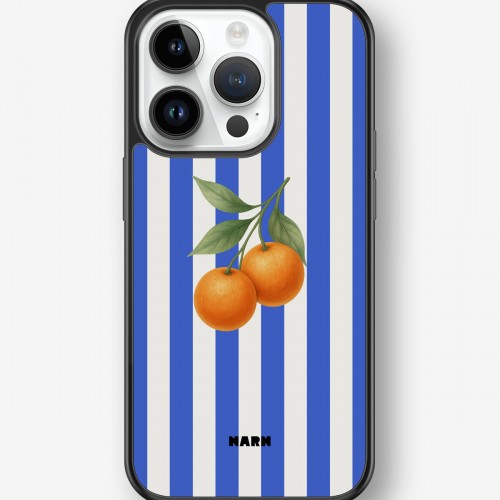 This design features: oranges, blue, citrus, white, stripes