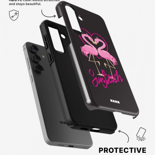 Meet the Tough Case for Samsung Galaxy A36 in the pattern: Beach Flamingo. Strong on the outside, soft on the inside. This case is made to protect your phone from daily drops, scratches and surprises while keeping it stylish.