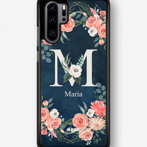 This design features: watercolor flowers, floral pattern, navy blue, monogram, romantic