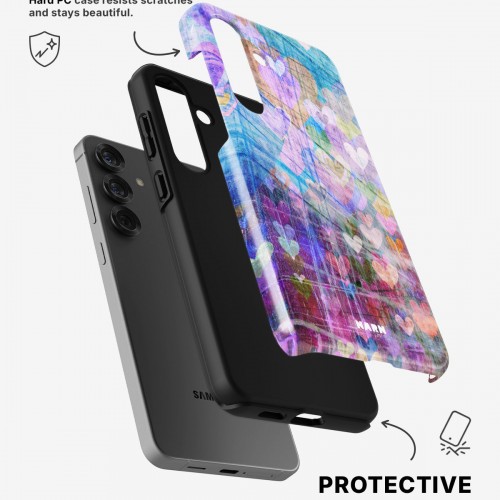 Meet the Tough Case for Samsung Galaxy A54 5G in the pattern: Purple Hearts. Strong on the outside, soft on the inside. This case is made to protect your phone from daily drops, scratches and surprises while keeping it stylish.