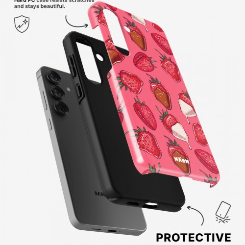 Meet the Tough Case for Samsung Galaxy A54 5G in the pattern: Strawberry Chocolate. Strong on the outside, soft on the inside. This case is made to protect your phone from daily drops, scratches and surprises while keeping it stylish.