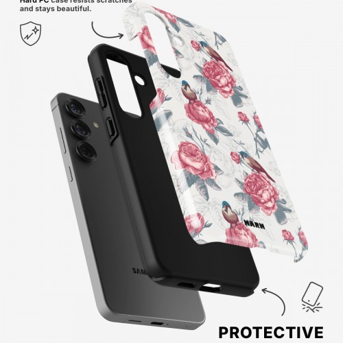 Meet the Tough Case for Samsung Galaxy A56 in the pattern: Birds Among Roses. Strong on the outside, soft on the inside. This case is made to protect your phone from daily drops, scratches and surprises while keeping it stylish.