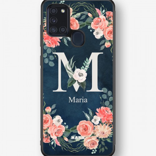 This design features: watercolor flowers, floral pattern, navy blue, monogram, romantic
