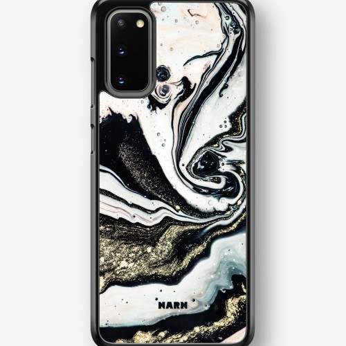 This design features: abstract, black and white, flowing, gold, marble