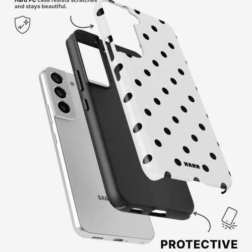 Meet the Tough Case for Samsung Galaxy S22 in the pattern: Mono Dots. Strong on the outside, soft on the inside. This case is made to protect your phone from daily drops, scratches and surprises while keeping it stylish.