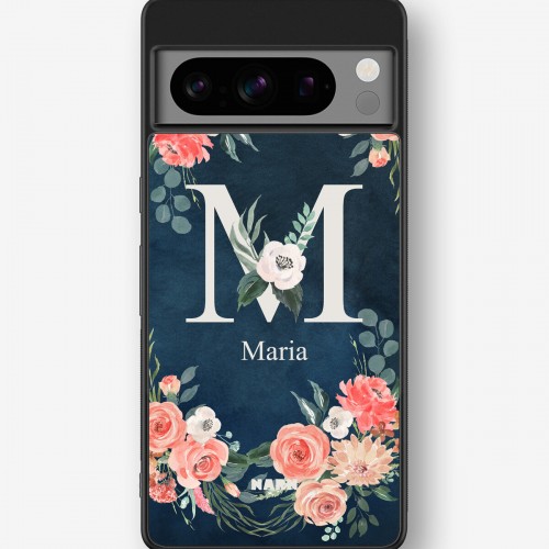 This design features: watercolor flowers, floral pattern, navy blue, monogram, romantic