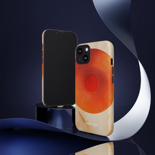 The Sunburst Swirl protective phone case features a striking central circular motif radiating with bold orange geometric patterns for an energetic visual impact. The surrounding elements include concentric circles and angular orange lines, introducing sharp contrast while guiding the eye to create balance and flow within the design. Distinctive for its crisp geometric structure and dynamic pattern repetition, this phone case exudes a confident, modern style—demonstrating precise artistic craftsmanship for lovers of design-led motifs and high-impact protection.