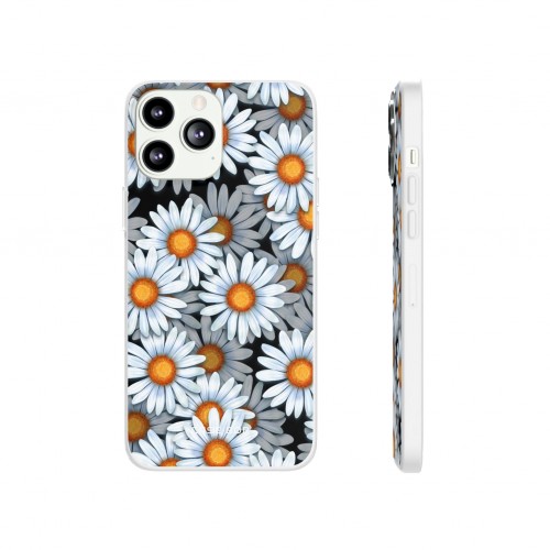 The main feature of this protective phone case is a bold central daisy, radiating vibrant yellow hues that dominate the floral design and draw immediate attention. Crisp circle motifs and subtle petal patterns surround the centerpiece, creating precise contrast while introducing visual flow and balance across the entire case. Distinctive characteristics include sharp outlines, modern symmetry, and a pattern that combines artistic style with technical precision, offering a striking motif crafted through refined attention to detail and design-led craftsmanship.